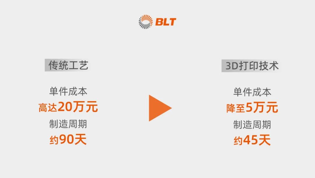 以两级轮盘为例,零件尺寸为340mm×340mm×55mm,采用BLT-S450设备一体打印成形。在传统工艺下,该零件从材料采购到加工,单件研制成本高达20万元,制造周期最少需3个月;利用3D打印技术,单件成本降至5万元,制造时长缩短至45天。这不仅显著提高了生产效率,实现了零件快速制造,还为结构设计的高效迭代提供了技术保障。