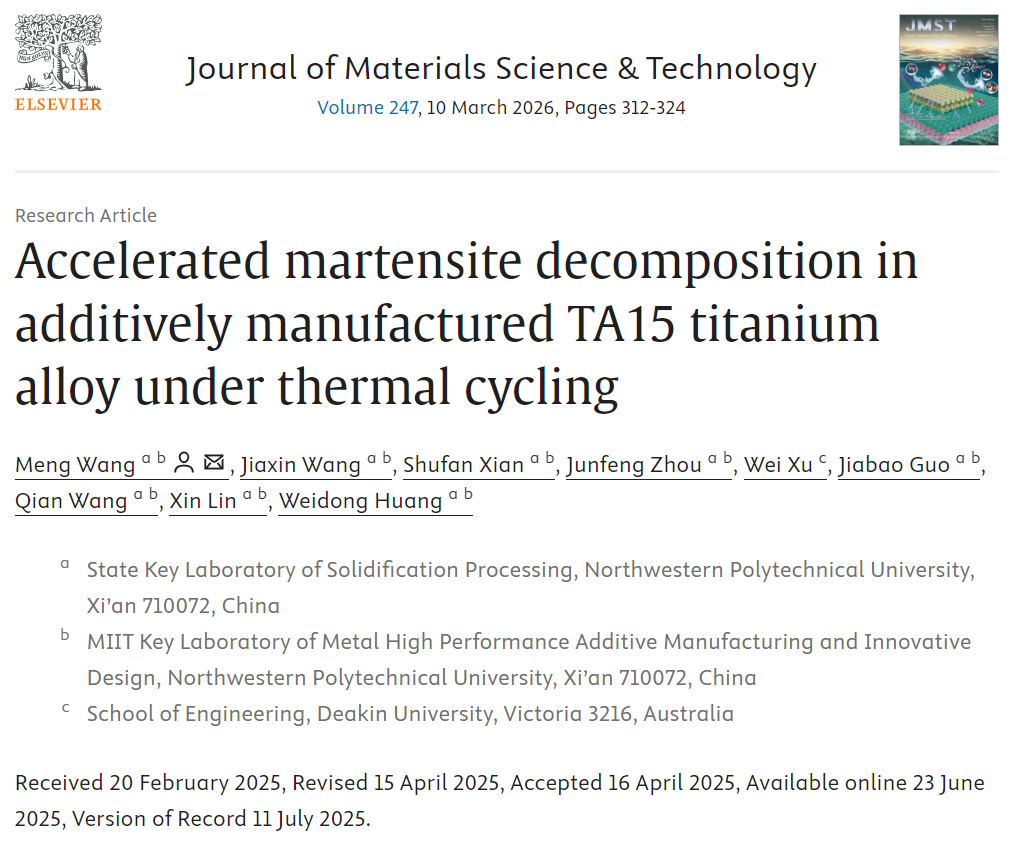 研究通过多尺度关联表征和高精度模拟,取得两项重大突破:其一,首次证实马氏体快速分解( 200秒)的核心驱动力是源于马氏体相内部的β稳定元素(如Mo, V)在纳米尺度上的偏聚,诱发纳米尺度β相在马氏体内析出;其二,这些β相形成“扩散通道”,极大缩短元素扩散距离和扩散时间,从而加速马氏体分解和α相优化。这些发现为提升增材制造钛合金的性能奠定重要科学基础。该研究形成成果“Accelerated martensite decomposition in additively manufactured TA15 titanium alloy under thermal cycling”,发表于材料科学领域顶级期刊Journal of Materials Science Technology上。目前,该期刊的影响因子为14.3。本文的通讯作者为黄卫东教授团队的王猛教授(博士生导师),其长期从事金属增材制造技术研究,核心专利成分及组织可控的激光立体成形方法获中国发明专利奖优秀奖。