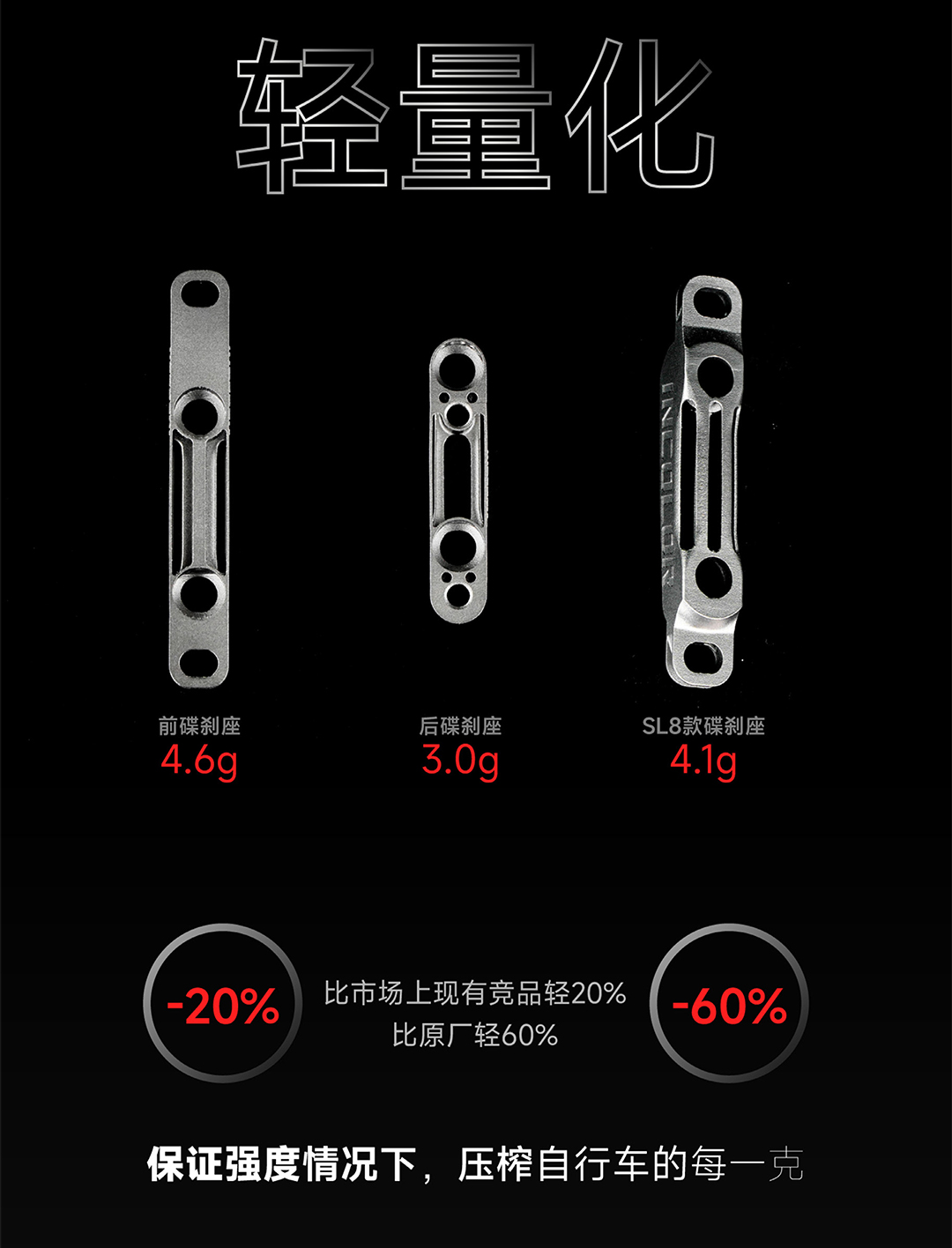 以轻量化碟刹座为例,采用BLT-TC4材料打印的前碟刹座仅重4.6g,后碟刹座仅重3g,SL8款碟刹座仅重4.1g,三款产品比市面上现有竞品轻20%,比原厂轻60%。BLT-TC4材料兼具优良的耐热性和热稳定性,确保碟刹座在制动高温条件下无明显热变形;其高强度特性使得零件减重后仍能具备900MPa以上的抗拉强度。采用BLT-TC4材料,整套车架组件亦比标准版减重约45 g。