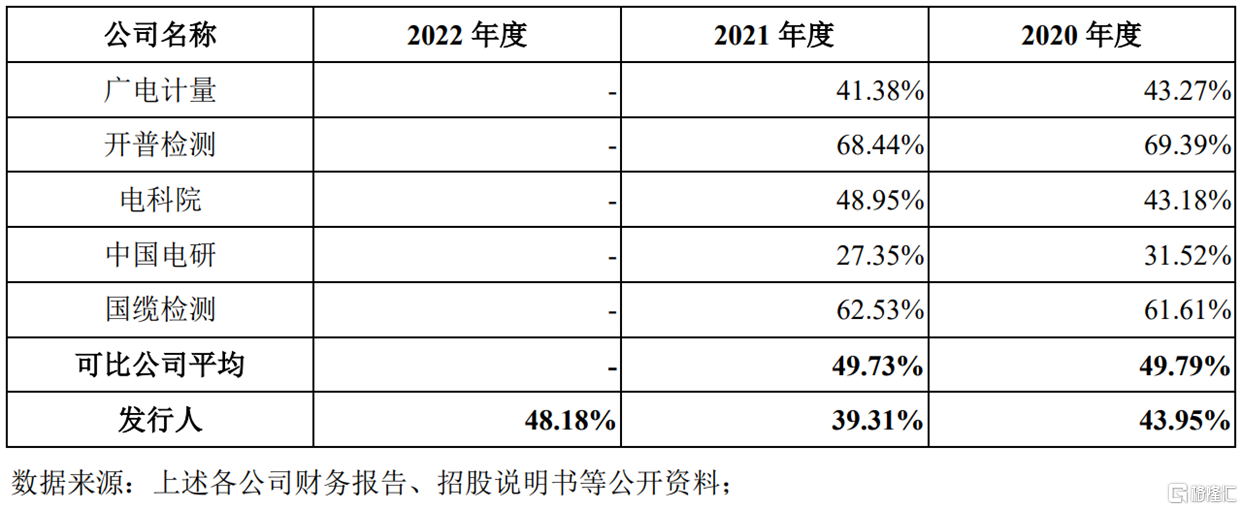 报告期内,公司综合毛利率分别为43.95%、39.31%和48.18%,呈现先降后升的态势,主要受下游市场需求、检测服务成本及技术先进性水平等多种因素影响,其中2020年、2021年均低于可比上市公司的均值水平。
