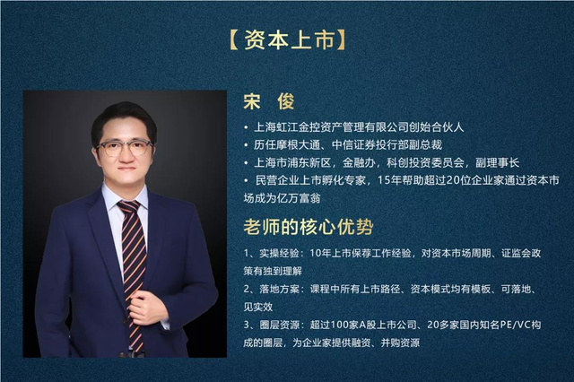 宋俊老师拥有资本上市辅导经验十余年,曾经担任华尔街海归投融资大咖导师、美国华盛顿国际资源集团基金经理、前摩根大通,交通国际投资银行部副总裁,是目前,上海虹江资本创始合伙人,担任上海浦东金融局投资行业协会、上海市虹口区青联委员会民营企业股权专家。