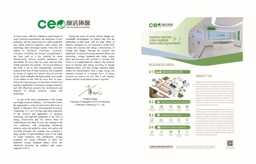 复洁环保作为中国污水污泥治理与节能低碳高端装备领域的领军企业,此次十分荣幸有机会作为赞助方之一,与多家业内知名企业共同助力这一经典著作的英文原版开源出版,公司创始人黄文俊董事长也特邀为该书作序推荐,并表达了公司在污水污泥处理领域的发展方向与未来愿景。