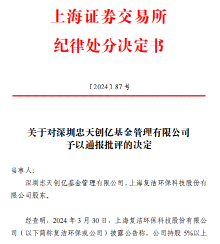 日前,复洁环保收到上交所出具的纪律处分决定书,公司股东忠创基金因短线交易公司股票被通报批评。