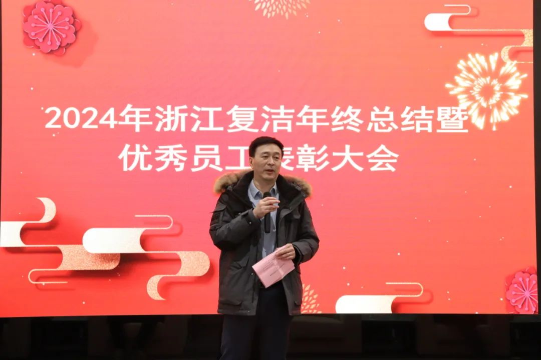 上海主会场觥筹交错、欢声笑语,与此同时,浙江生产基地坚守一线的同事们也在分享着新年的喜悦。2025年1月22日,浙江复洁“金蛇启航,逐梦前行”2024年终总结暨优秀员工表彰大会在复洁环保浙江生产基地举行。会议回顾了过去一年浙江复洁工作,表彰了浙江复洁优秀新员工、优秀员工、优秀管理者和优秀班组。