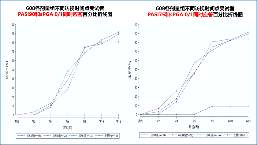 公司自主研发的抗IL-17A单抗608在用于治疗中重度斑块状银屑病患者的II期临床试验中显示出潜在同类更优的疗效。在12周诱导治疗期,608三个剂量组分别可使89.3%、80.6%、91.4%的受试者同时实现PASI 90和sPGA 0/1,46.4%、48.4%和57.1%的患者可实现皮损完全清除(PASI 100),而安慰剂组则无应答(0)。研究显示,608药物起效快,首次给药后2~4周开始起效,持续至整个治疗周期,且安全性良好可控。