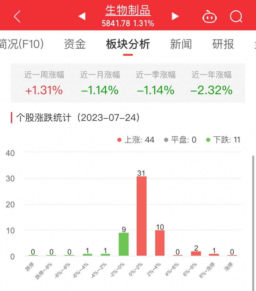 7月24日讯今日,生物制品板块整体涨幅1.31%,其中44只股票上涨,11只股票下跌。