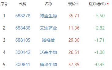 特宝生物、艾迪药业、诺唯赞、沃森生物、康华生物位列涨幅榜后五位,涨幅分别为-5.50%、-2.82%、-1.71%、-1.08%、-0.95%。