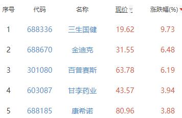 其中,三生国健、金迪克、百普赛斯、甘李药业、康希诺位列板块涨幅前五位,涨幅分别为9.73%、6.48%、6.19%、3.94%、3.88%。