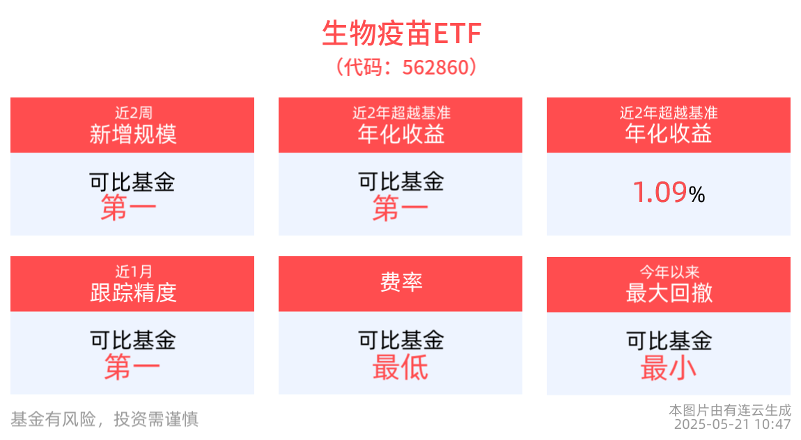规模方面,生物疫苗ETF近2周规模增长132.04万元,实现显著增长,新增规模位居可比基金第一。