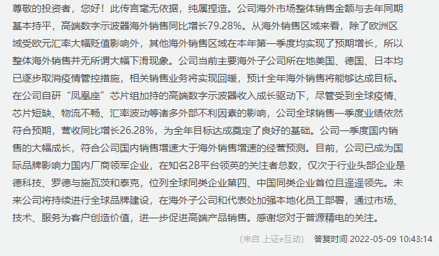 近日,普源精电在上证e互动答复了投资者对其2022年第一季度海外收入大幅下滑的质疑。普源精电将海外市场的大幅下滑归因于欧元汇率的下跌,并未解释欧洲市场下降的具体比例及其他主要海外市场的状况。