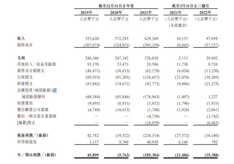 2019年-2021年及2022年第一季度,公司收入分别为5.54亿元、5.73亿元、6.3亿元和9705.9万元;期内利润分别为4589.9万元、-976.2万元、-1.85亿元和-3588.8万元。