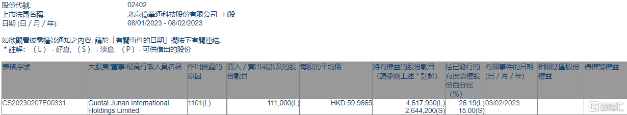 根据联交所最新权益披露资料显示,2023年2月3日,亿华通(02402.HK)获Guotai Junan International Holdings Limited在场内以每股均价59.9665港元增持好仓11.1万股,涉资约665.63万港元。