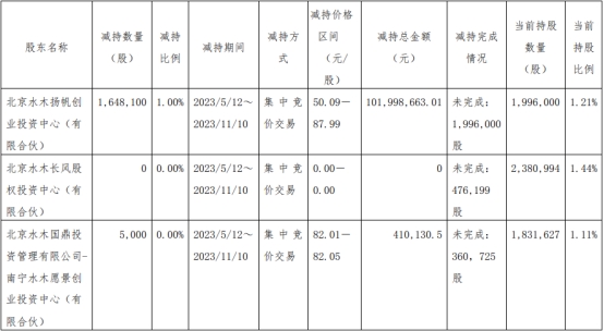 公司于近日收到股东北京水木扬帆创业投资中心(有限合伙)(以下简称“水木扬帆”)、北京水木长风股权投资中心(有限合伙)(以下简称“水木长风”)、北京水木国鼎投资管理有限公司-南宁水木愿景创业投资中心(有限合伙)(以下简称“水木愿景”)出具的《关于股份减持时间届满暨减持结果的告知函》,获知水木扬帆、水木长风、水木愿景以集中竞价、大宗交易或询价转让的方式累计减持公司股份1,653,100股,占公司总股本的1.00%,减持总金额为102,408,793.51元。