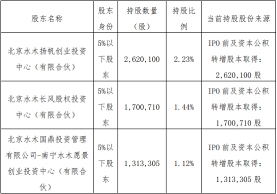 本次减持计划实施前,水木扬帆持有公司股份2,620,100股,水木长风持有公司股份1,700,710股,水木愿景持有公司股份1,313,305股。水木扬帆、水木长风、水木愿景的普通合伙人均为北京水木创信投资管理中心(普通合伙),构成一致行动人关系,合计持有公司股份5,634,115股,占公司总股本的4.79%。