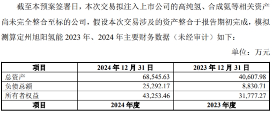 截至预案签署日,本次交易拟注入上市公司的高纯氢、合成氨等相关资产尚未完全整合至标的公司,假设本次交易涉及的资产整合于报告期初完成,模拟测算定州旭阳氢能2023年、2024年营业收入分别为40,515.21万元、32,001.36万元,净利润分别为5,903.30万元、2,313.71万元。