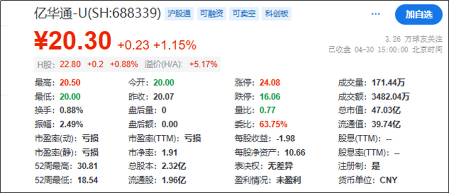 截至4月30日收盘,亿华通报20.30元/股,涨1.15%,总市值47亿元。