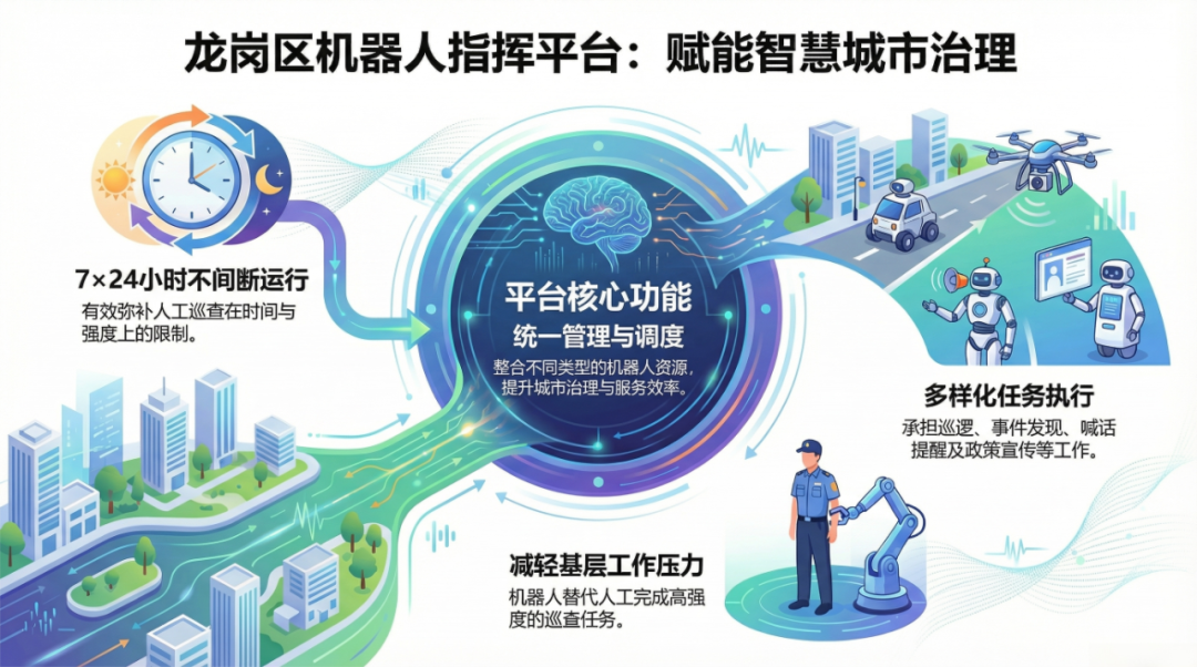 龙岗区机器人指挥平台(一期)则通过对多形态机器人的统一管理、部署和调度,整合不同类型的机器人资源,提升机器人在城市治理和公共服务中的应用效率。在大运中心及周边区域,机器人将根据场景需求承担巡逻、事件发现、喊话提醒、政策宣传等工作,并支持7×24小时运行,有效弥补人工巡查的时间与强度限制,减轻基层工作人员压力。