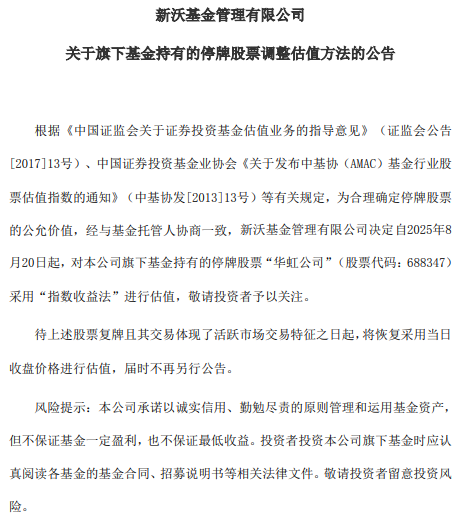 公告称,新沃基金管理有限公司决定自2025年8月20日起,对旗下基金持有的停牌股票“华虹公司”(股票代码:688347)采用“指数收益法”进行估值,敬请投资者予以关注。
