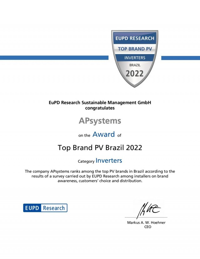 EuPD Research是全球太阳能行业最具权威的市场调研机构之一,拥有丰富的研究经验,其颁发的“顶级光伏品牌”的奖项在国际光伏行业中也享有盛誉,拥有极高的认可度。EuPD通过对全球新能源产业的安装商、分销商的多层次民意调查和分析,选出在产品质量、品牌满意度、品牌忠诚度等多个指标上表现卓越的企业。昱能科技凭借在巴西地区强大的品牌影响力和产品实力,跻身“顶级逆变器品牌”,这不仅是安装商、分销商对昱能的支持与认可,同时更加彰显了昱能的国际品牌实力。