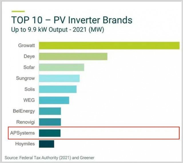 根据巴西权威能源研究机构Greener发布的报告显示,在2021年巴西光伏逆变器(<9.9kW)出货量排名统计中,昱能科技位列第九位。由于微型逆变器产品在单价上高出组串式逆变器产品较多,若从销售额角度来看,昱能科技的排名还将大幅提升。