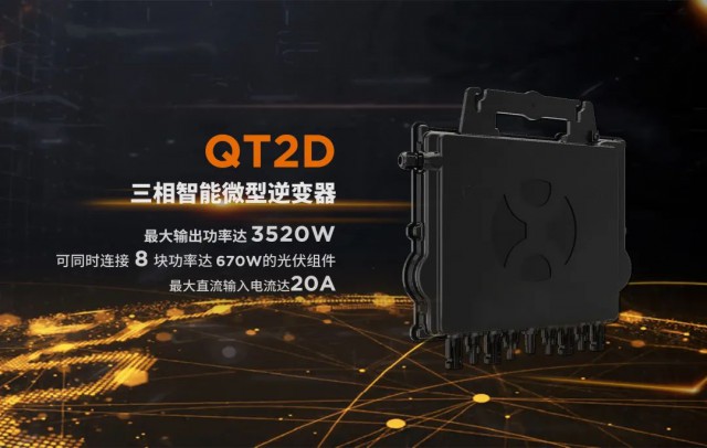 QT2D作为全新的三相八体微型逆变器,最大直流输入电流达20A,可以同时连接8块功率达670W的光伏组件,最大输出功率达3520W;支持1.5倍超配,确保在提高系统发电量的同时降低系统成本;达到IP67防护等级,可在-40℃~65℃环境下长期稳定运行,满足光伏电站各种应用场景需求。