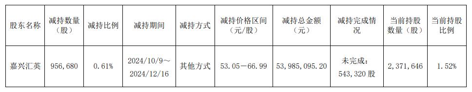 截止目前,上述减持计划已经实施完毕。公司于2025年1月9日收到公司股东嘉兴汇英出具的《减持计划完成暨减持结果的告知函》,在减持计划期间内,嘉兴汇英通过盘后定价方式累计减持公司股份956,680股,占公司总股本的0.61%。嘉兴汇英减持总金额为5398.51万元。