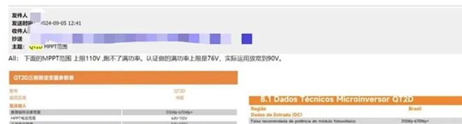 “ QT2D型微逆的产品手册( 昱能科技 官网下载)中宣称,该产品工作电压范围为52V-120V,MPPT电压范围为64V-110V。但实际使用过程中,总承包方发现产品实际性能与标称参数似乎存在偏差。”爆料者拿出了疑似双方的沟通邮件:信息显示, 昱能科技 明确承认“MPPT 范围上限 110V仅为理论值,无法跑满功率;产品认证的满功率上限为76V,实际应用中放宽至90V”——那么,当电压超过90V时,逆变器可能无法达到标称功率。