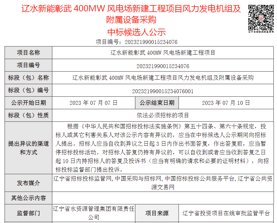 风芒能源获悉,7月7日,辽水新能彰武400MW风电场新建工程项目机组采购开标,三一重能预中标,投标总价5.75亿元。项目建设地点:位于辽宁省阜新市彰武县,装机规模400MW,建设工期: 2年。