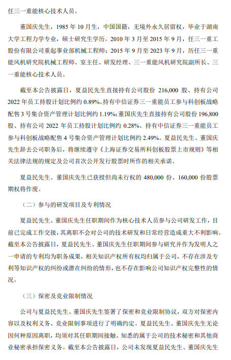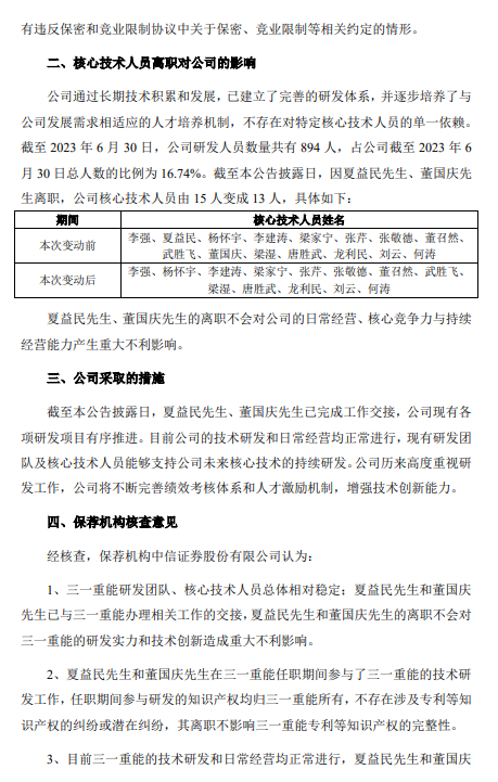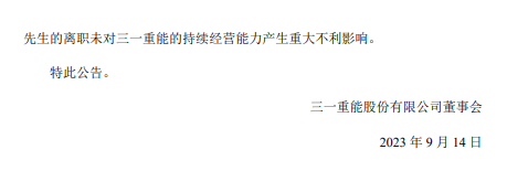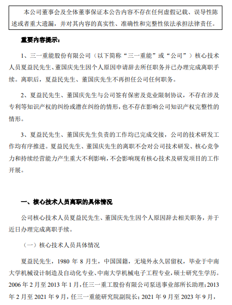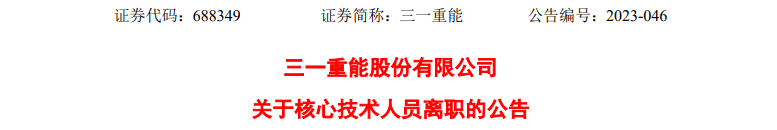 2023年9月14日,三一重能股份有限公司发布《关于核心技术人员离职的公告》,公告称,三一重能核心技术
