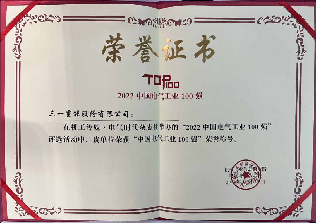 11月23日,第19届中国电气工业发展高峰论坛暨“第23届中国电气工业100强研究”发布会在北京举行,三一重能股份有限公司(以下简称:三一重能)凭借出色业绩再度入选“中国电气工业100强”榜单,彰显了三一重能在电气工业的行业领先地位。