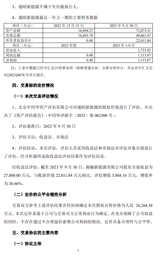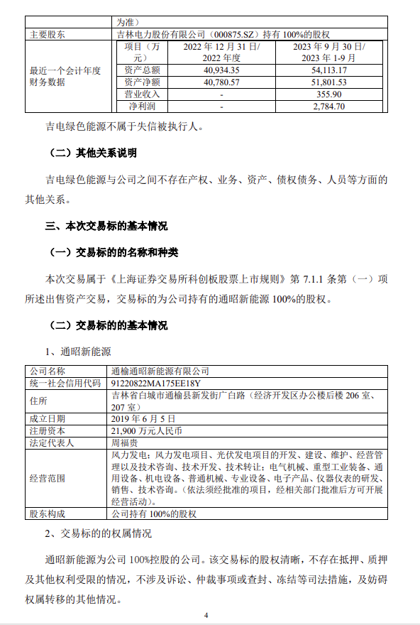 湘榆新能源成立于2022年1月30日,持有通榆开通风力发电有限公司100%的股权,通榆开通持有位于吉林省白城市通榆县的三一通榆碳纤维智慧风机试验基地项目,目标项目已于2023年8月31日建成且全容量并网发电。公司通过重能国际间接持有湘榆新能源100%的股权。
