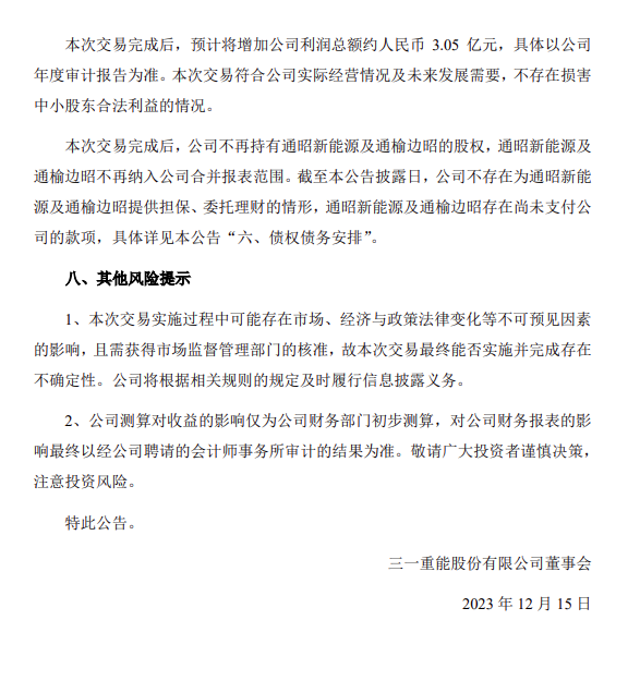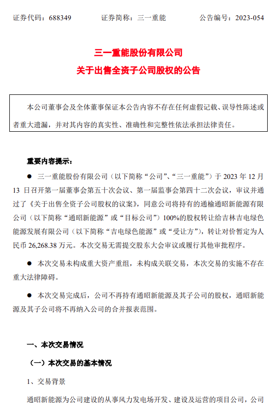 近日,三一重能发布关于出售全资子公司股权的公告。