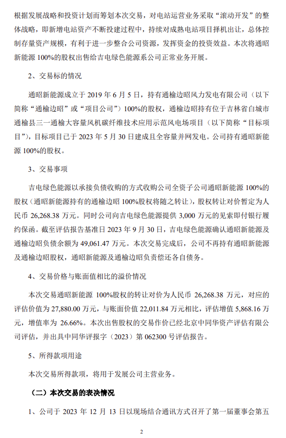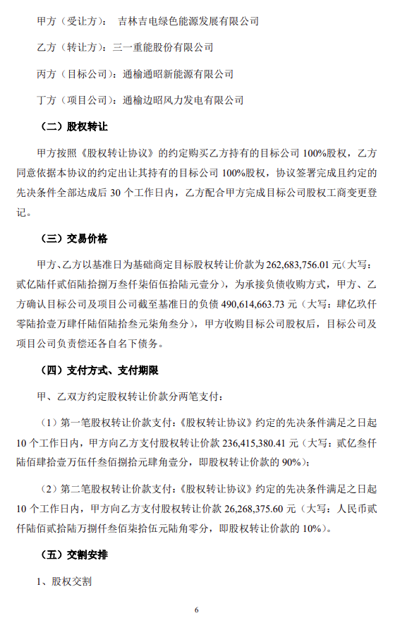 根据公告显示,三一重能将全资子公司重能国际控股有限公司其持有的吉林省湘榆新能源有限公司100%的股权转让给吉林吉电绿色能源发展有限公司,转让对价暂定为人民币26268.38 万元。