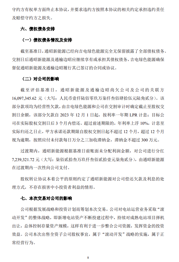 针对本次交易对公司的影响,三一重能表示,根据发展战略和投资计划而筹划本次交易,公司对电站运营业务采取“滚动开发”的整体战略,即新增电站资产不断投建过程中,持续对成熟电站项目择机出让,总体控制存量资产规模,这样有利于进一步整合公司资源,发挥资金的投资效益。三一重能本次出售全资子公司股权事宜,属于“滚动开发”战略的实施,属于正常经营行为