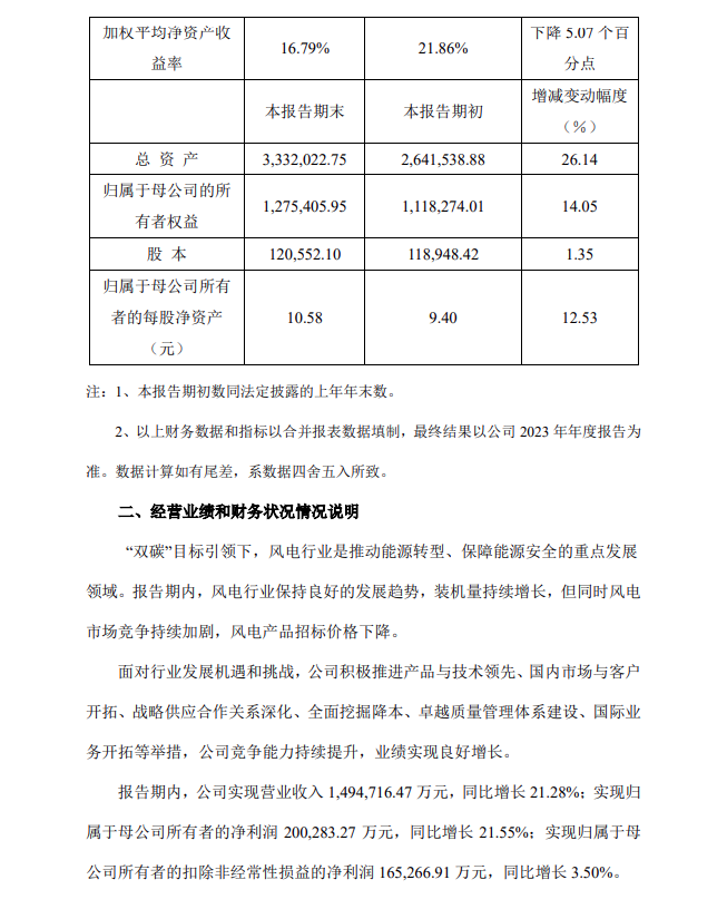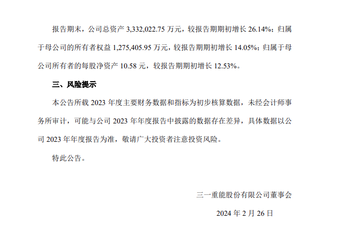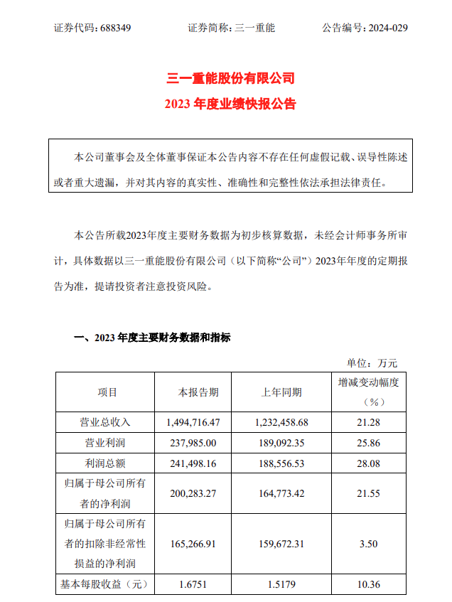 2月26日,三一重能公布2023年业绩快报。报告期内,该公司实现营业收入1,494,716.47万元,同比增长21.28%;实现归属于母公司所有者的净利润200,283.27万元,同比增长21.55%。