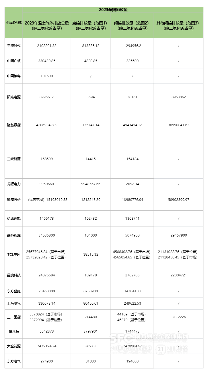 为统一计算口径,前述7家企业的范围3排放量不计入总量计算,三峡能源及亿纬锂能因未披露2022年温室气体排放总量不计入排名。