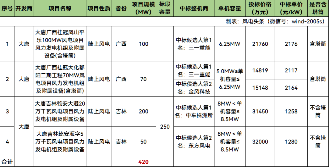 10月17日,大唐广西桂冠凤山平乐100MW风电项目、大唐广西桂冠大化都阳二期工程70MW风电项目、大唐吉林乾安大遐20万千瓦风电项目、大唐吉林乾安海字5万千瓦风电项目风力发电机组及附属设备采购中标候选人公示,项目规模总计420MW。