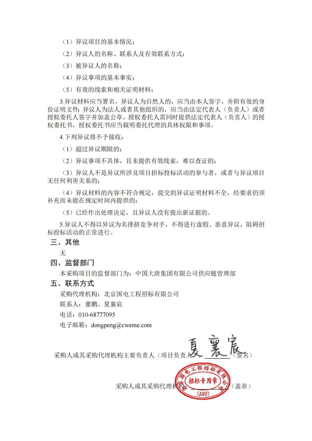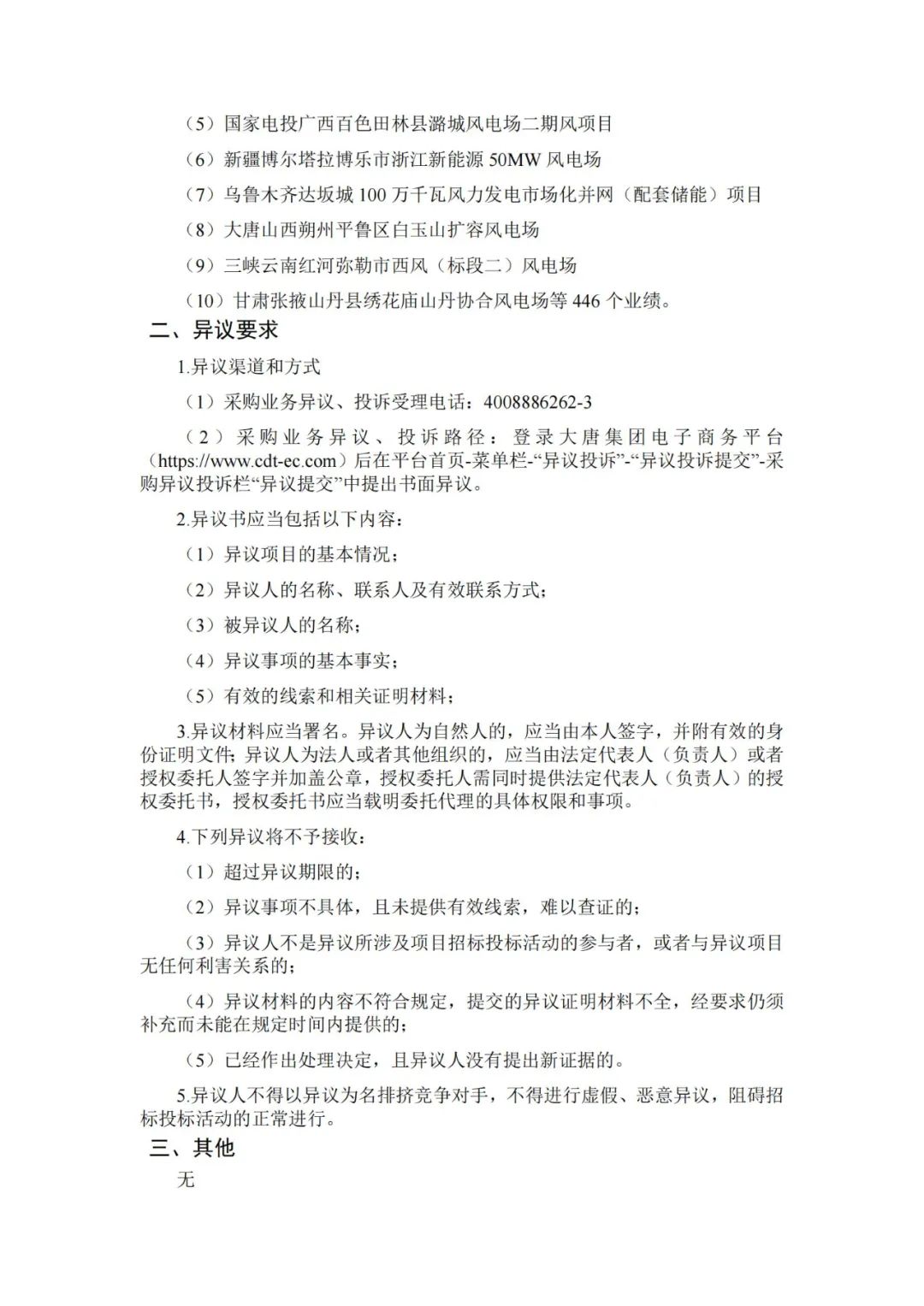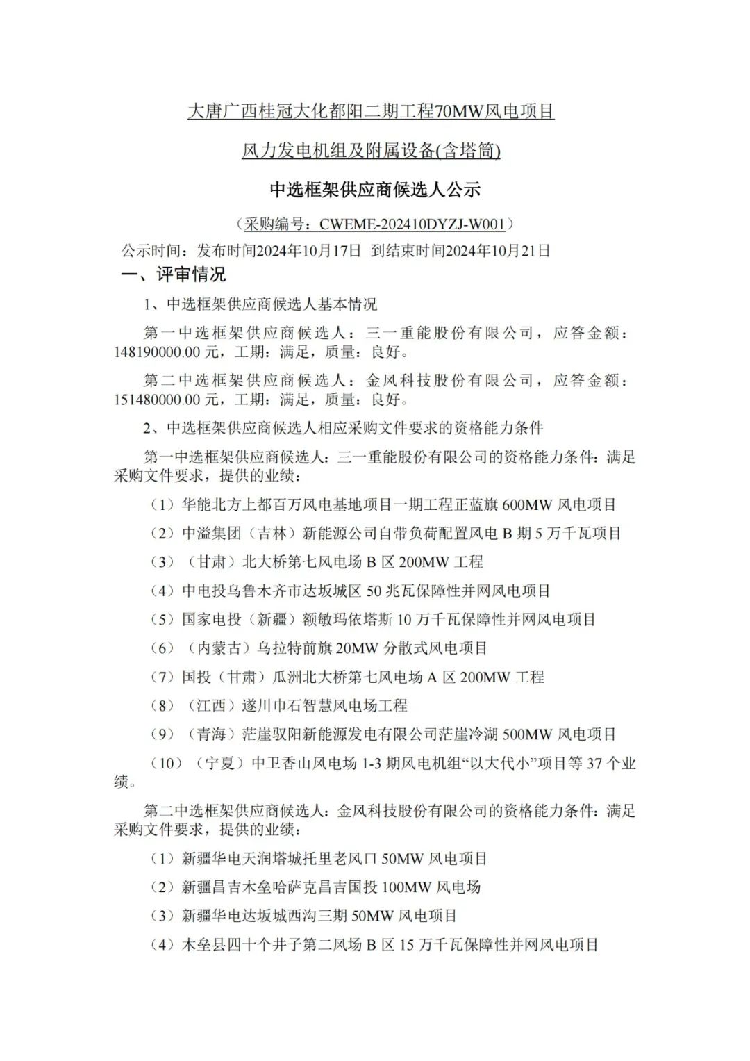 大唐广西桂冠大化都阳二期工程70MW风电项目位于广西壮族自治区河池市大化瑶族自治县,项目容量70MW,不允许浮动;单机容量5.0MW≤单机容量≤6.25MW;叶轮直径204m及以下;轮毂高度120m及以上;接受混排,机型不超过两种;不接受降容;限定钢塔,不接受柔塔;交货期:2025年3月供货首套,6月底供货4套(不含首套),2025年8月底前陆续完成全部供货。