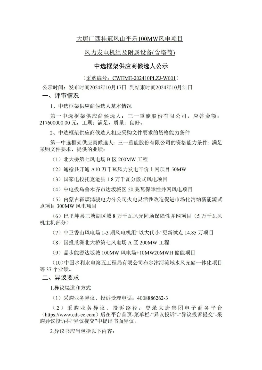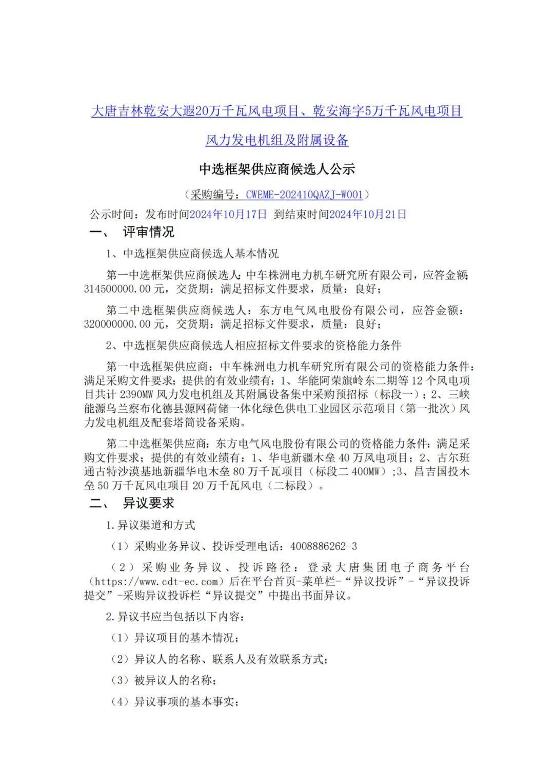 根据公示,三一重能、中车株洲所作为第一中标候选人预中标。