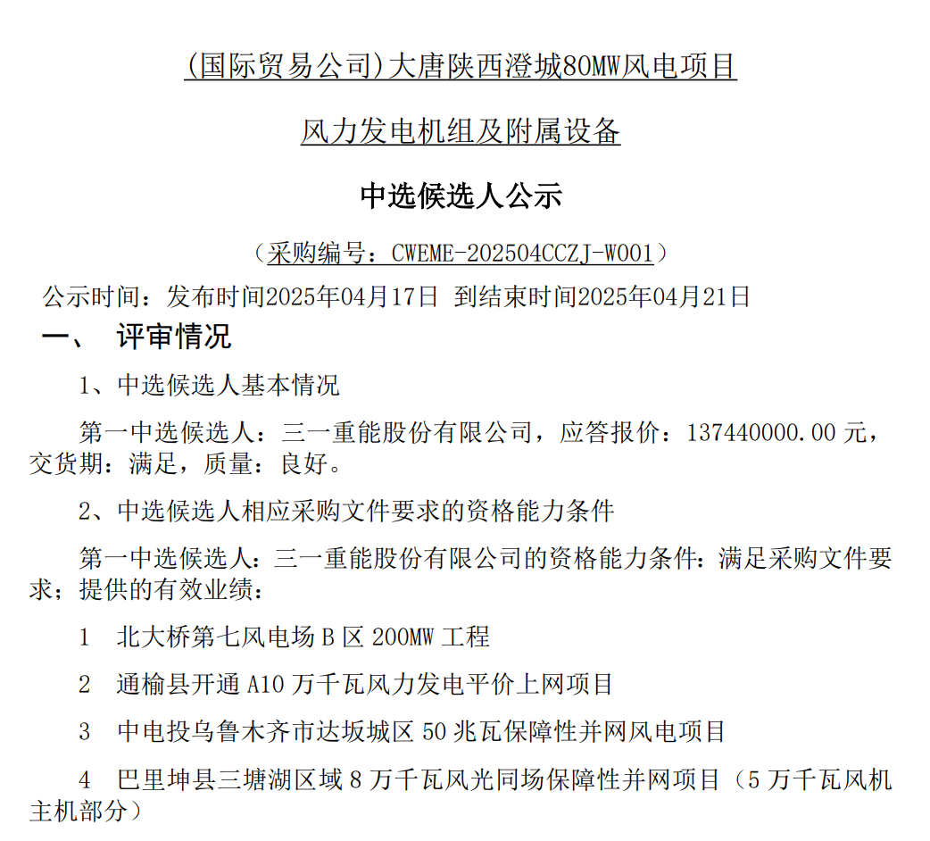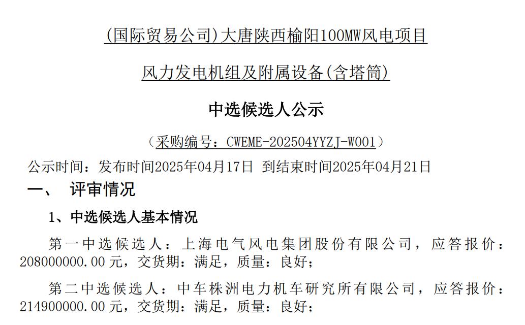 北极星风力发电网获悉,4月17日,大唐陕西榆阳100MW风电项目和大唐陕西澄城80MW风电项目风力发电机组及附属设备中标候选人公示,电气风电预中标100MW,投标报价2.08亿元,含塔筒单价2080元/kW;三一重能预中标80MW,投标报价1.3744亿元,不含塔筒单价1718元/kW。