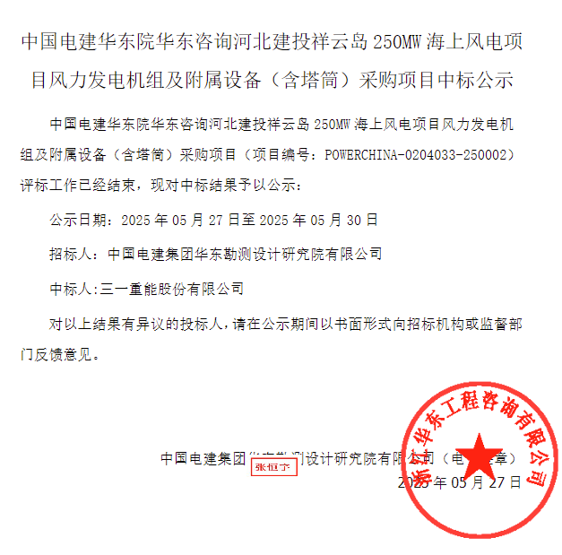 5月27日,中国电建华东院华东咨询河北建投祥云岛250MW海上风电项目风力发电机组及附属设备(含塔筒)采购项目中标公示,三一重能中标,中标价:75378万元。