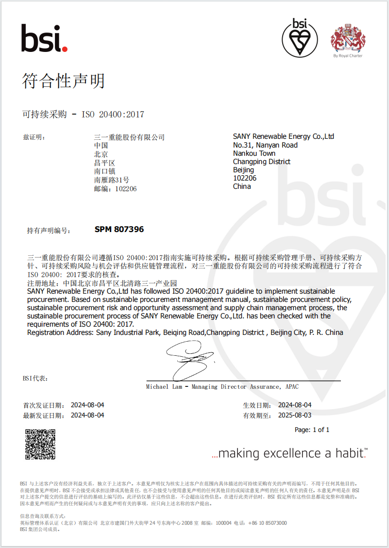 身为新能源“链主”企业,为了将可持续发展能力辐射至全供应链,三一重能持续将ESG管控措施整合至采购流程中。2024年,三一重能取得行业内首个ISO20400可持续采购符合性声明,通过制定供应商可持续行为准则、开展企业社会责任评估、ESG赋能培训等行动,降低供应链对经济、环境和社会的影响,建设可持续发展的供应生态圈。