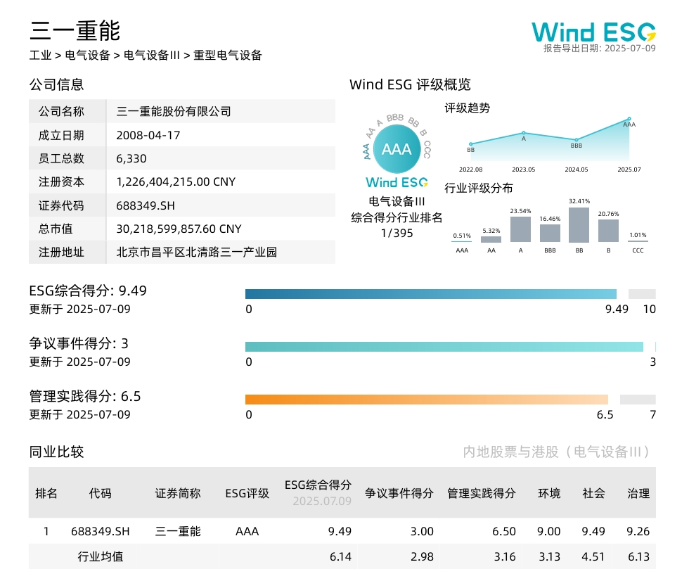 在备受关注的Wind ESG评级中,三一重能凭借在环境、社会及治理维度的卓越表现,荣膺最高AAA评级,综合得分高达9.49分(满分10分),在电气设备行业395家入选企业中位列榜首。这不仅是对三一重能长期深耕ESG管理的权威认证,更印证了其可持续发展体系已走在行业最前列。