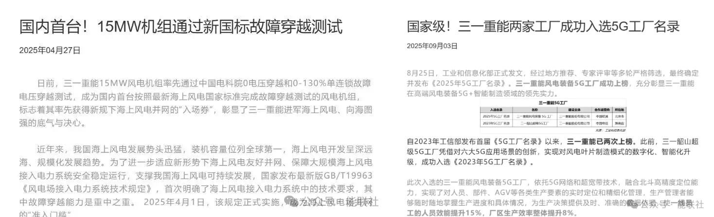 作为全球综合排名第六、国内综合前五名的风电整机商,三一重能近年的发展不缺亮点。比如,其15MW风电机组率先通过中国电科院0电压穿越和0-130%单连锁故障电压穿越测试,成为国内首台按照最新海上风电国家标准完成故障穿越测试的风电机组;再如,今年8月公布的工信部2025年5G工厂名录,三一重能两家风电装备5G工厂上榜。但抛开光环看背后,这位80后新帅在此时接手,至少在业绩表现层面算不得一个好时机。