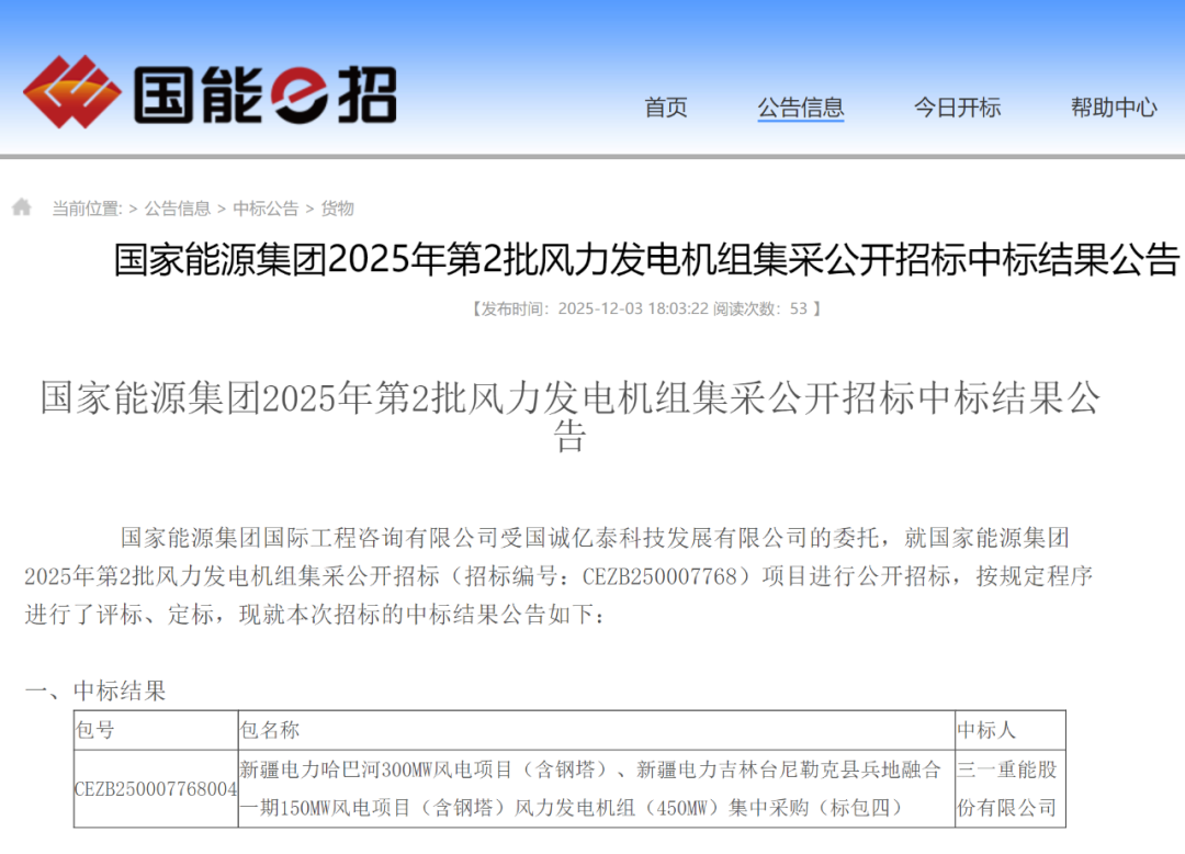 12月3日, 国家能源集团 发布新疆电力哈巴河300MW风电项目(含钢塔)、新疆电力吉林台尼勒克县兵地融合一期150MW风电项目(含钢塔)风力发电机组集中采购中标结果公示,规模共计450MW, 三一重能 中标。