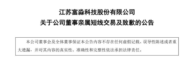 3月19日晚间,富淼科技(688350)发布公告称,公司近日获悉董事吴邦元的配偶缪丽芳于2023年5月4日至2024年3月18日期间买卖公司股票。根据相关规定,上述交易构成短线交易。