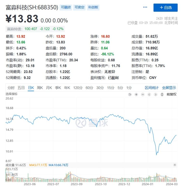 值得一提的是,富淼科技2023年5月4日最高价达到18.80元,2024年3月18日已跌至13.83元,缪丽芳短线交易期间,股价跌超26%。截至3月19日收盘,富淼科技报13.83元/股,总市值16.89亿元。