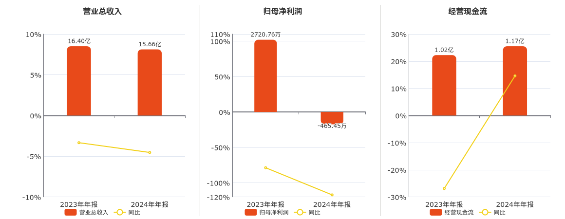 公司营业总收入为15.66亿元,较去年同报告期营业总收入减少7449.50万元,同比较去年同期下降4.54%。归母净利润为-465.45万元,较去年同报告期归母净利润减少3186.21万元,同比较去年同期下降117.11%。经营活动现金净流入为1.17亿元。