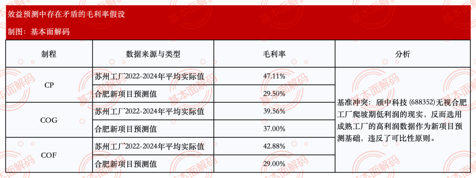 然而,在对同样位于合肥的“高脚数微尺寸凸块封装及测试项目”进行效益测算时,颀中科技(688352)却完全摒弃了合肥工厂的实际运营数据。取而代之的是,颀中科技(688352)采用了其成熟、稳定的苏州工厂的历史毛利率作为预测基准,并明确表示预测值“均略低于苏州工厂对应制程毛利率水平”。例如,其预测新项目CP制程的毛利率为29.50%,而苏州工厂2022-2024年的平均毛利率高达47.11%;预测COF制程毛利率为29.00%,而苏州工厂同期平均值为42.88%。