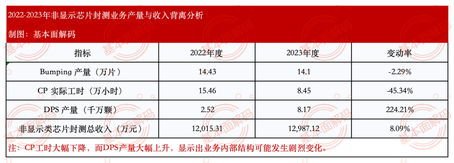 然而,对颀中科技(688352)披露的产销数据或异常。在2023年度,颀中科技(688352)非显示业务中的核心前段工序——Bumping的产量(产量)从2022年的14.43万片下降至14.10万片。与此同时,非显示芯片封测业务的总收入却从2022年的人民币1.20亿元增长至2023年的人民币1.30亿元。